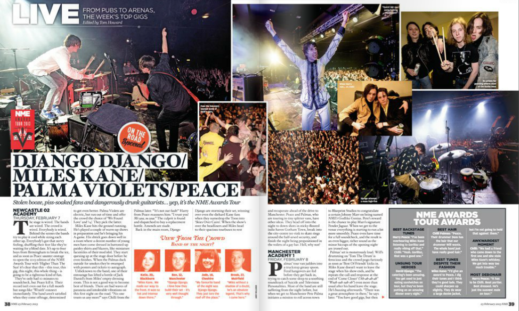 The stage is wired. The bands are wired. The crowd is wired. We’re all totally wired. Behind the scenes the bands try to play it cool while sizing each other up. Everybody’s got that nervy feeling, shuffling their feet like they’re waiting for a blind date. It’s up to four boys from B-Town to break the ice, and as soon as Peace saunter onstage to open the 2013 edition of the NME Awards Tour with ‘Higher Than The Sun’ it’s clear that this – this tour, this gig, this night, this whole thing – is going to be a righteous kind of Fun.
