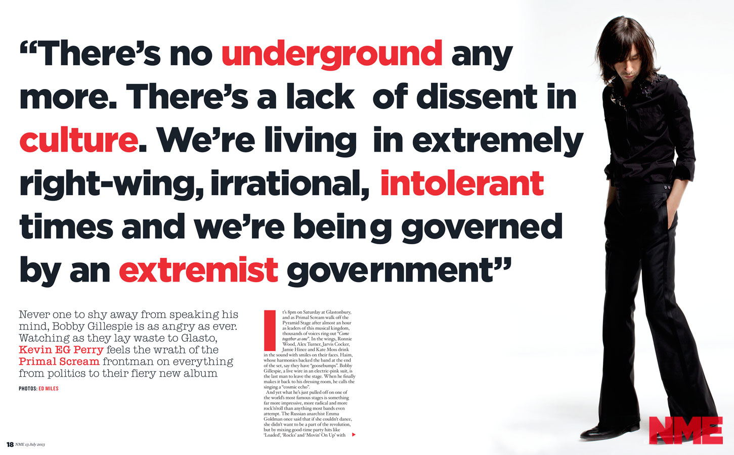 In 2013, we’ve grown strangely uneasy with the idea of our rock’n’roll stars as political agitators. Call it the ‘Bono effect’, but ordinarily we don’t like the idea of being preached at when we’re trying to get our rocks off. But ever since Woody Guthrie daubed “This Machine Kills Fascists” on his guitar, standing up for the voiceless and disenfranchised has been an essential part of what makes rock’n’roll what it is, and nobody knows that quite like Bobby Gillespie.