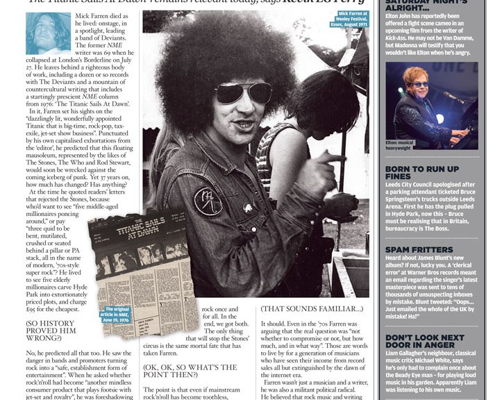 Punk arrived, as he knew it would, but this Titanic proved unsinkable. He lifted his title from Dylan’s ‘Desolation Row’, and the iconoclastic spirit of the piece is captured in the next few lines: “The Titanic sails at dawn / And everybody’s shouting / ‘Which side are you on?’” Farren wanted us to pick sides. He wanted punk’s safety pins to puncture the inflated egos of heritage rock once and for all. In the end, we got both. The only thing that will stop The Stones’ circus is the same mortal fate that took Farren.