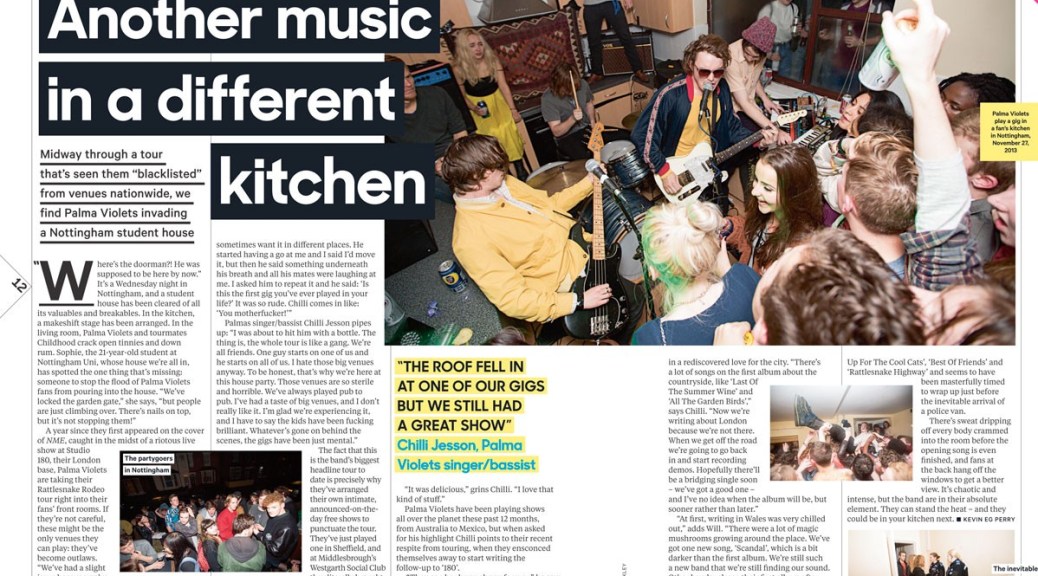 “Where’s the doorman? He was supposed to be here by now.” It’s a Wednesday night in Nottingham, and a student house has been cleared of all its valuables and breakables. In the kitchen, a makeshift stage has been arranged. In the living room, Palma Violets and Childhood crack open tinnies and down rum. Sophie, a 21-year-old student at Nottingham Uni, whose house we’re all in, has spotted the one thing that’s missing: someone to stop the floods of Palma Violets fans from pouring into the house. “We’ve locked the garden gate,” she says, “but people are just climbing over. There’s nails on top, but it’s not stopping them.”