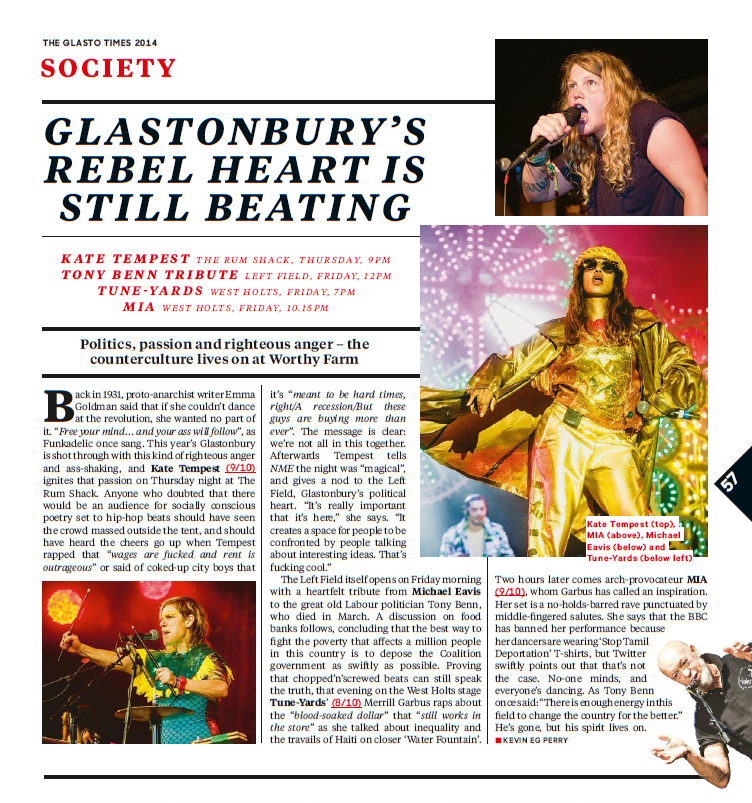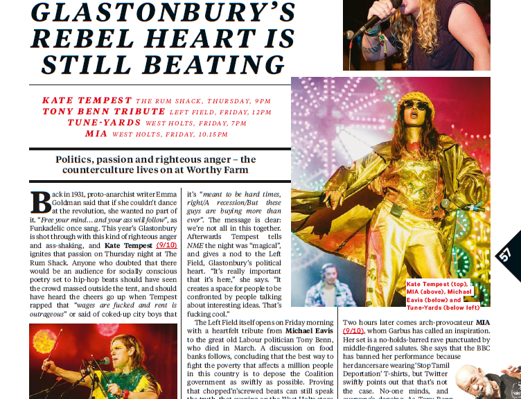 Back in 1931, proto-anarchist writer Emma Goldman told the world that if she couldn’t dance at the revolution, she wanted no part of it. “Free your mind… and your ass will follow”, as Funkadelic put it. This year’s Glastonbury is shot through with this kind of righteous anger and ass-shaking, and Kate Tempest ignites that passion on Thursday night at the Rum Shack. Anyone who doubted that there would be an audience for socially-conscious poetry set to hip-hop beats should have seen the crowd massed outside the tent. They should have heard the cheers go up when Tempest rapped that “wages are fucked and rent is outrageous” or said of city boys buying coke that it’s “meant to be hard times, right / a recession / but these guys are buying more than ever.” The message is clear: we’re very much not all in this together. After her set Tempest said the night was “magical”, and gave a nod to the Left Field, Glastonbury’s political heart. “I think it’s really important that it’s here,” she says. “It creates a space for people to be confronted by people talking about interesting ideas. That’s fucking cool.”