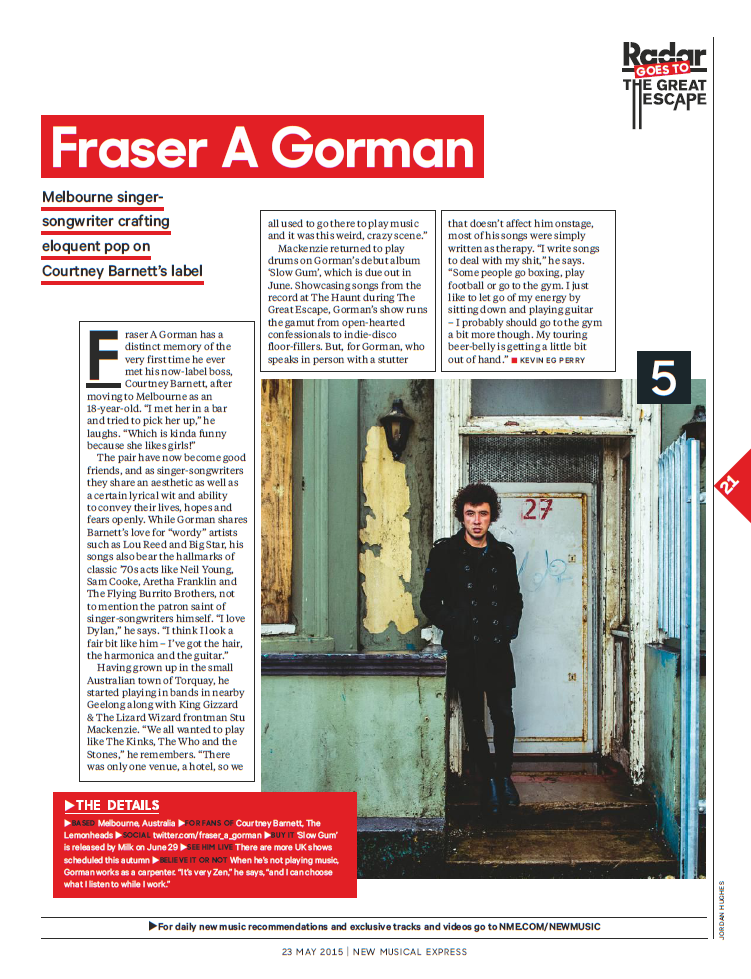 Mackenzie returned to play drums on Gorman’s debut album ‘Slow Gum’, which is due out in June. Showcasing songs from the record at The Haunt during The Great Escape, Gorman’s show ran the gamut from open-hearted confessionals to indie disco floor-fillers. But for Gorman, who speaks in person with a stutter that doesn’t affect him onstage, most of his songs were simply written as therapy. “I write songs to deal with my shit,” he says. “Some people go boxing, play football or go to the gym. I just like to let go of my energy by sitting down and playing guitar – I probably should go to the gym a bit more though. My touring beer-belly is getting a little bit out of hand.”